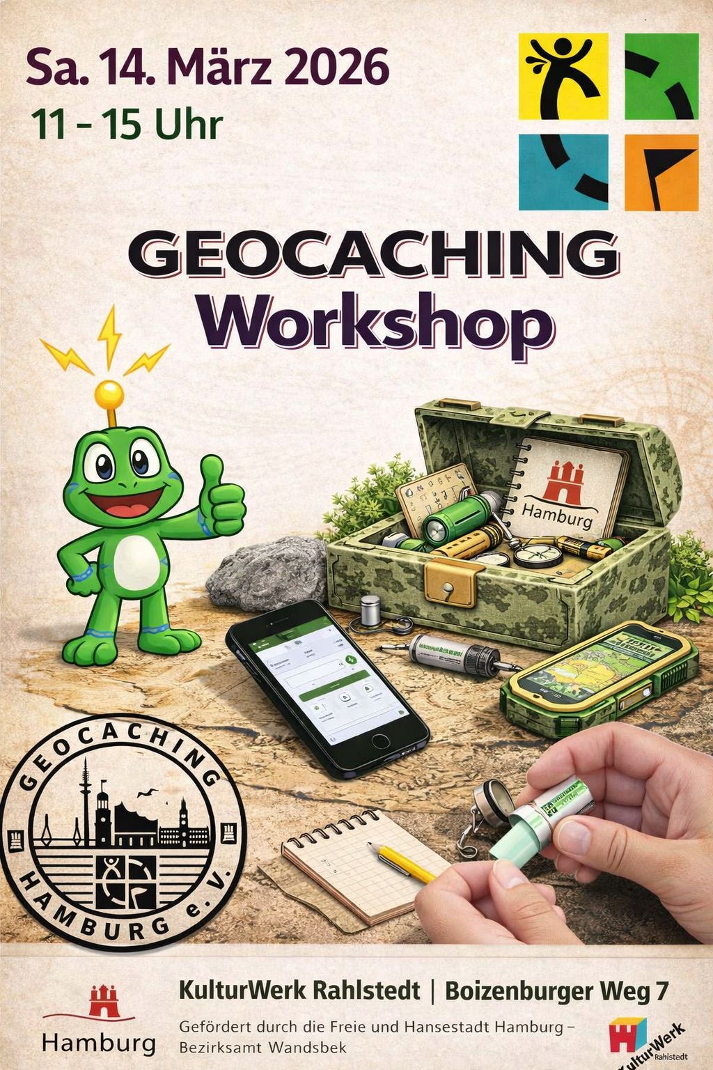 In diesem Workshop zeigen erfahrene Geocacher:innen, wie Geocaching funktioniert und was den Reiz dieses Hobbys ausmacht. Du erfährst, wie eine Suche abläuft, worauf es ankommt und warum Millionen Menschen weltweit immer wieder auf Schatzsuche gehen.